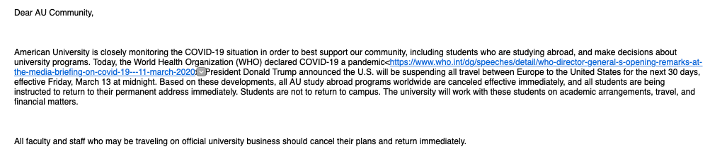 I wake up on March 12th with pounding on my door with my friend saying “Trump will be closing the borders, we need to go home.” It is 3:30am in Greece. It becomes very chaotic. I don’t even think about anything except getting a hold of my parents and getting on a plane home immediately. AU sent us an email stating we needed to be home as soon as possible.