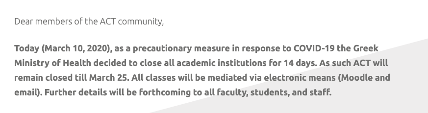 I called my mom and we started getting a little worried. Maybe two hours after I sent that email, we get news that Greece is going to be shutting down schools for two weeks start March 11th. There was no news from ACT, just an article saying that the Greek Ministry of Health has put this into place.