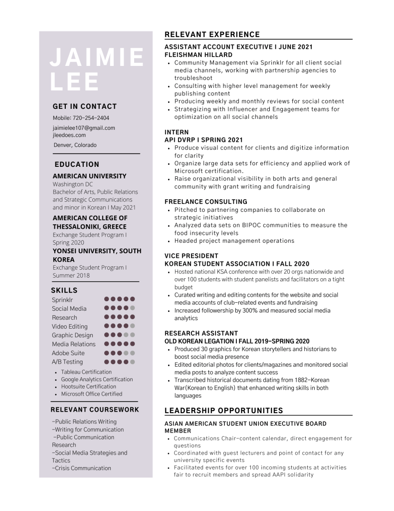 I am a graduating senior from American University. These are some examples of the work I have produced during my 4 years, but I hope to learn more in the years to come. Check out my resume, senior portfolio client work, and sample writing pieces.